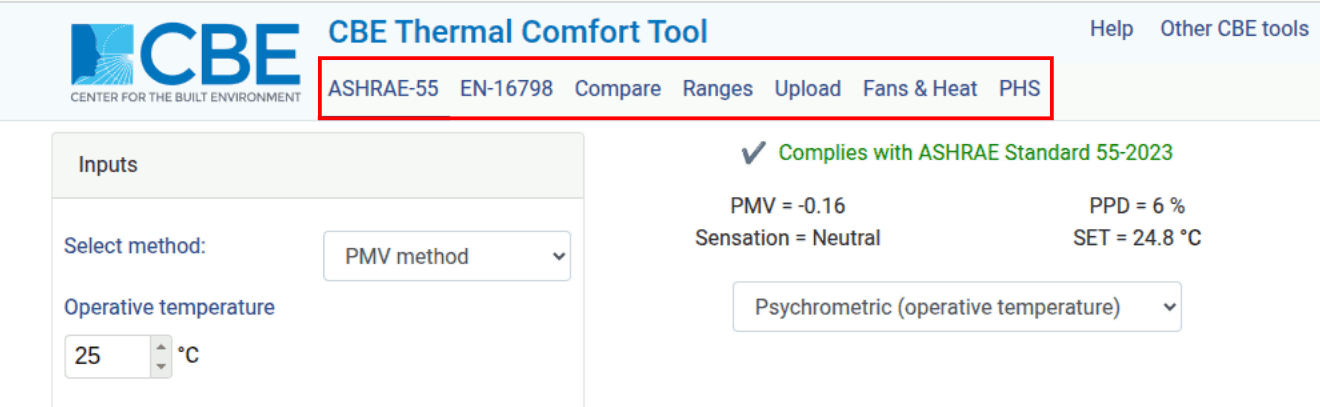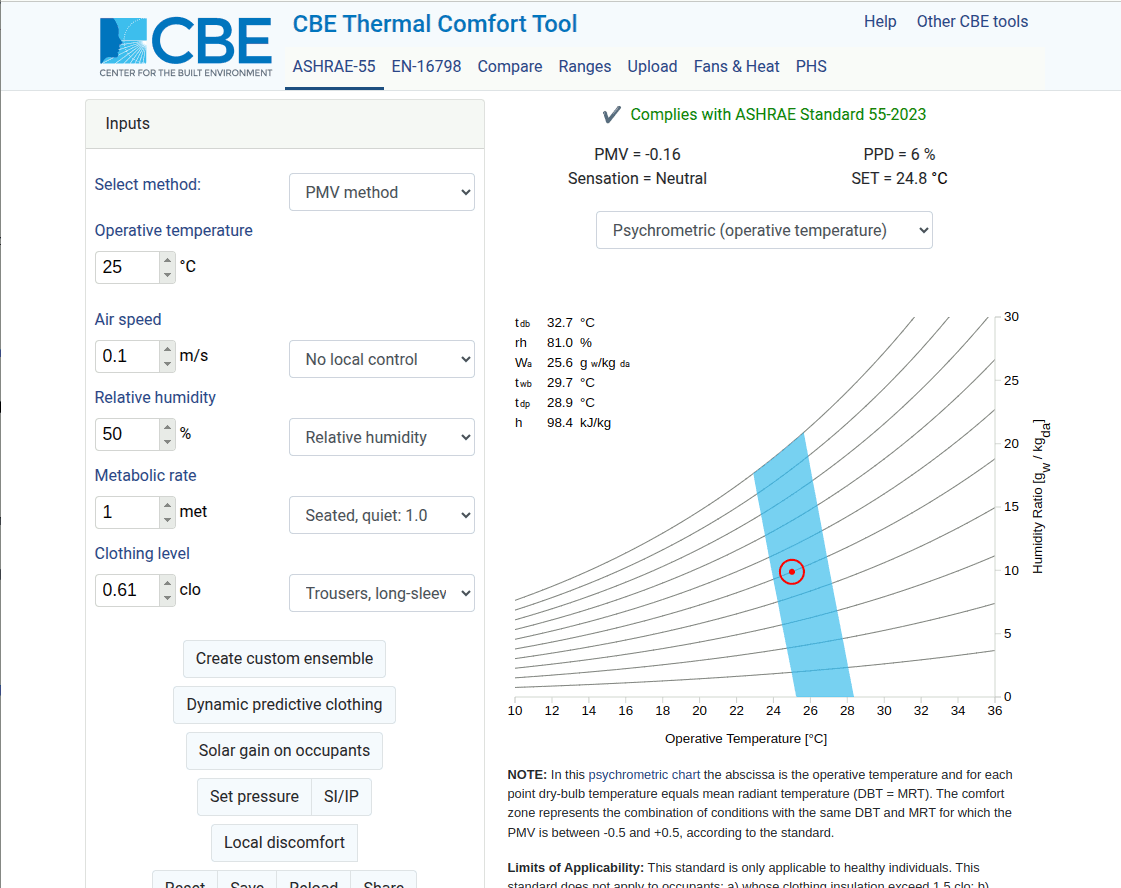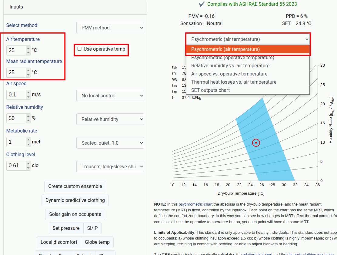 We will use the ASHRAE-55 Predicted Mean Vote (PMV) method for this tutorial. On the left bar you only see 5 factors: Operative temperature, Air speed, Relative humidity, Metabolic rate and clothing level. Air temperature and Mean Radiant Temperature (MRT) are missing and replaced by operative temperature. Operative temperature is a metric that combines both the air temperature and MRT, at its simplest form it is expressed as the average of air temperature and MRT. Read more about it on its wikipedia entry.