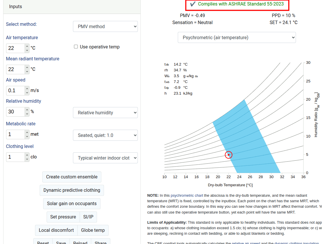 Clothing level = 1, Typical winter indoor clothingIt complies with the ASHRAE Standard 55. For winter, based on the model an air temperature of 22 degC (71.6 degF) setpoint shld be sufficient to keep a person comfortable, if the other conditions as specified are met. The PMV vote is -0.49 (0 being neutral not hot and not cold) with Percentage of People Dissatisfied (PPD) = 10% that means 10% of the people in the room might be unsatisfied with the thermal condition.