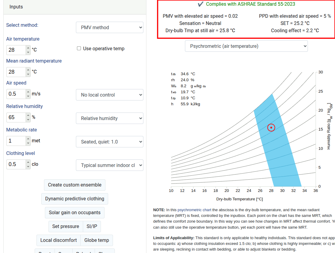 Clothing level = 0.5, Typical summer indoor clothingIt complies with the ASHRAE Standard 55. For summer, based on the model an air temperature of 28 degC (82.4 degF) setpoint shld be sufficient to keep a person comfortable, if the other conditions as specified are met. The PMV vote is 0.02 with Percentage of People Dissatisfied (PPD) = 5%.