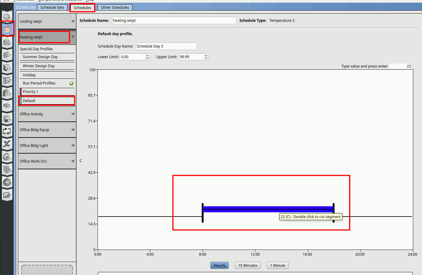 From the thermal comfort model. A heating setpoint of 22degC and cooling setpoint of 28degC are sufficient for thermal comfort. Let’s edit the set point schedules accordingly. Open the shoebox.osm model and go to the schedules. Select the cooling setpoint and Default schedule. Change teh set point to 28 degC as shown in the image below.