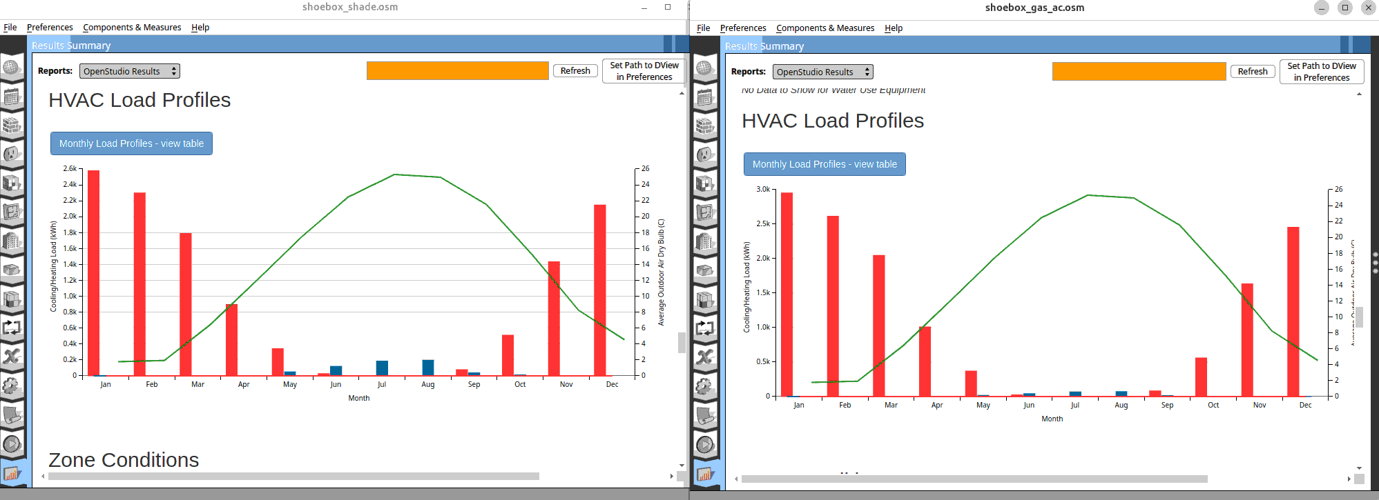 Open the baseline simulation and compare the two results side by side. You will realise ‘shoebox_gas_ac.osm’ uses more energy. You can also see that the cooling energy consumption is lower while the heating is higher. Why is that so?