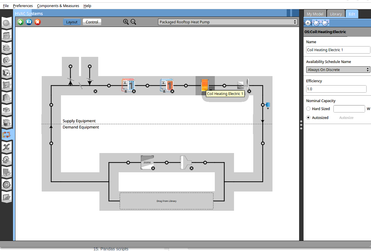 The system is very similar to the previous system. The main difference is for heating. Heating is now done with heat pump with a complimentary electric heating coil. The cooling and heating coil has a Rated COP of 3 and 5. The electric heating coil has an efficiency of 1.0. That means all input electricity to the electric coil heater becomes heat. Add the thermal zone to the system layout as shown in step 5 of the previous section.