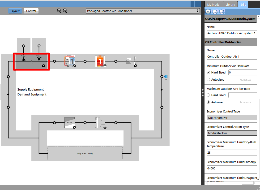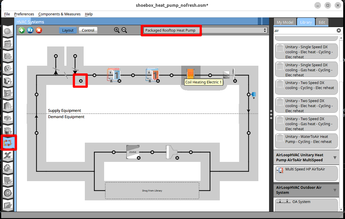 In the HVAC systems tab. Select the ‘Packaged Rooftop Heat Pump’. ‘AirLoopHVAC:OutdoorAirSystem’ and click on ‘x’ to delete the fresh air intake.