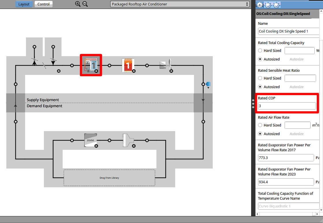 Now let’s take a look at the Layout of the HVAC system. It uses a DX cooling coil, which is similar to an air-conditioning unit. If you click on the coil you can see it has a Rated COP of 3. It means that with 1 unit of electricity, it can move 3 units of heat for cooling. We will keep the rest of ther parameters as default.