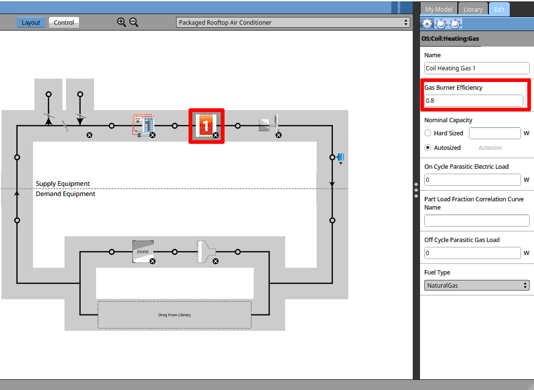 It uses a gas furnace as its heating coil. Click on the heating coil and you can see the Gas Burner Efficiency (it is essentially the AFUE) is 0.8. Change the ‘Fuel Type’ to ‘Natural Gas’.