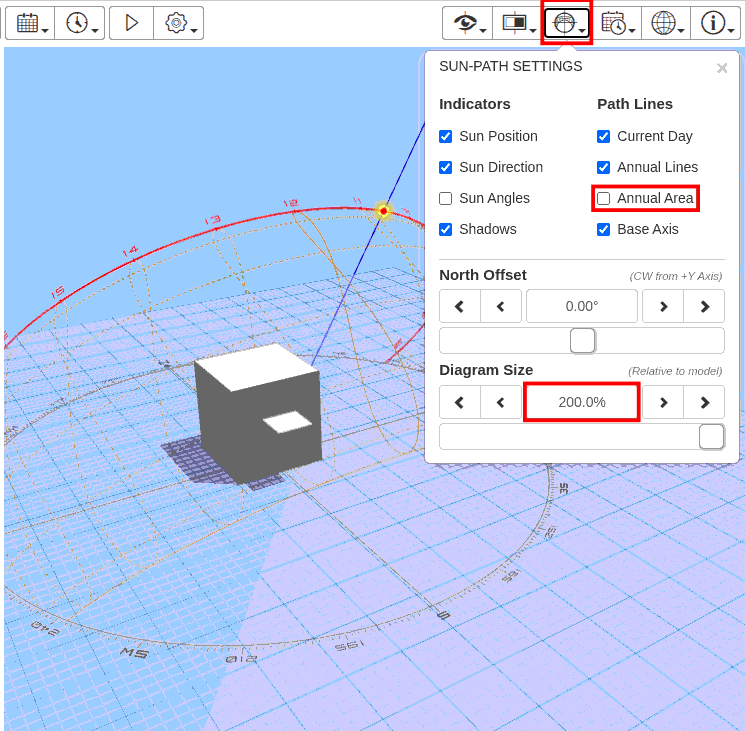 Go to Sun-path Setting. Change the Diagram Size to 200% and untick Annual Area.