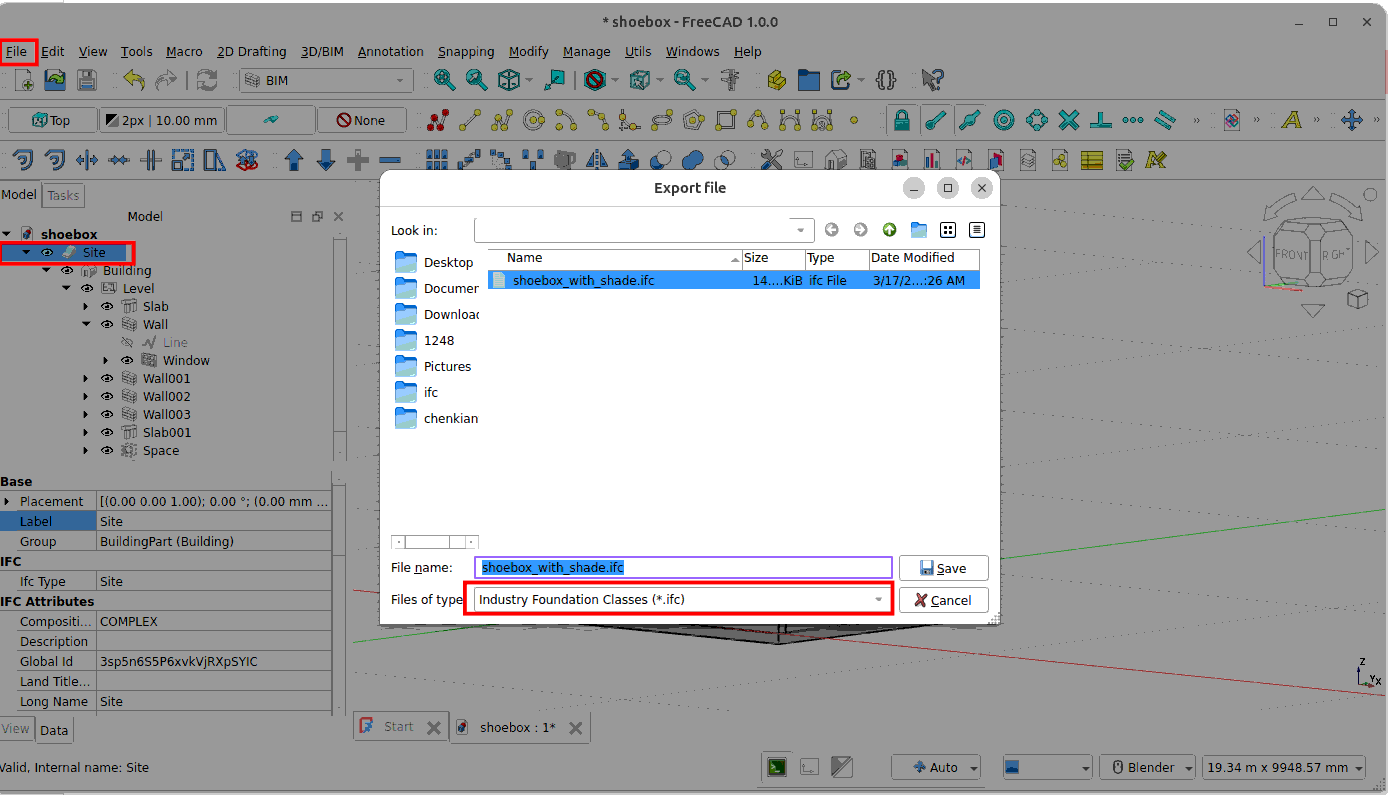 Open the shoebox model with shade in FreeCAD and export it to IFC. Select Site. Then go to File -> Export. Export it to .ifc.