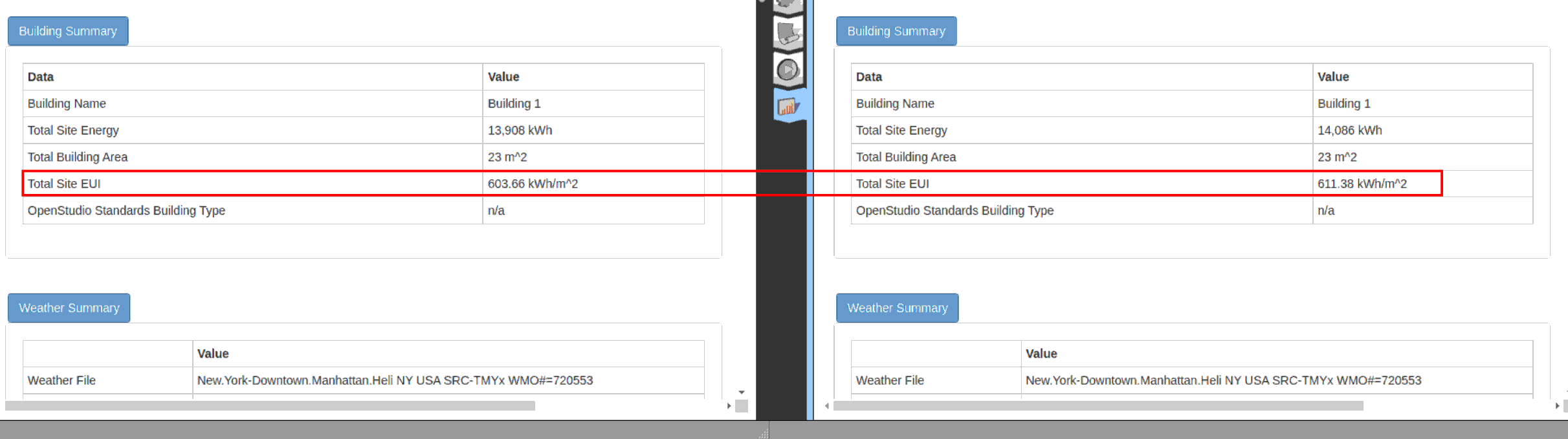 After you run the simulation. Open the results and look at them side by side to see the results. In my case the EUI reduce from 611 kWh/m2 to 603 kWh/m2. A ~1.5% (8 kWh/m2) decrease.
