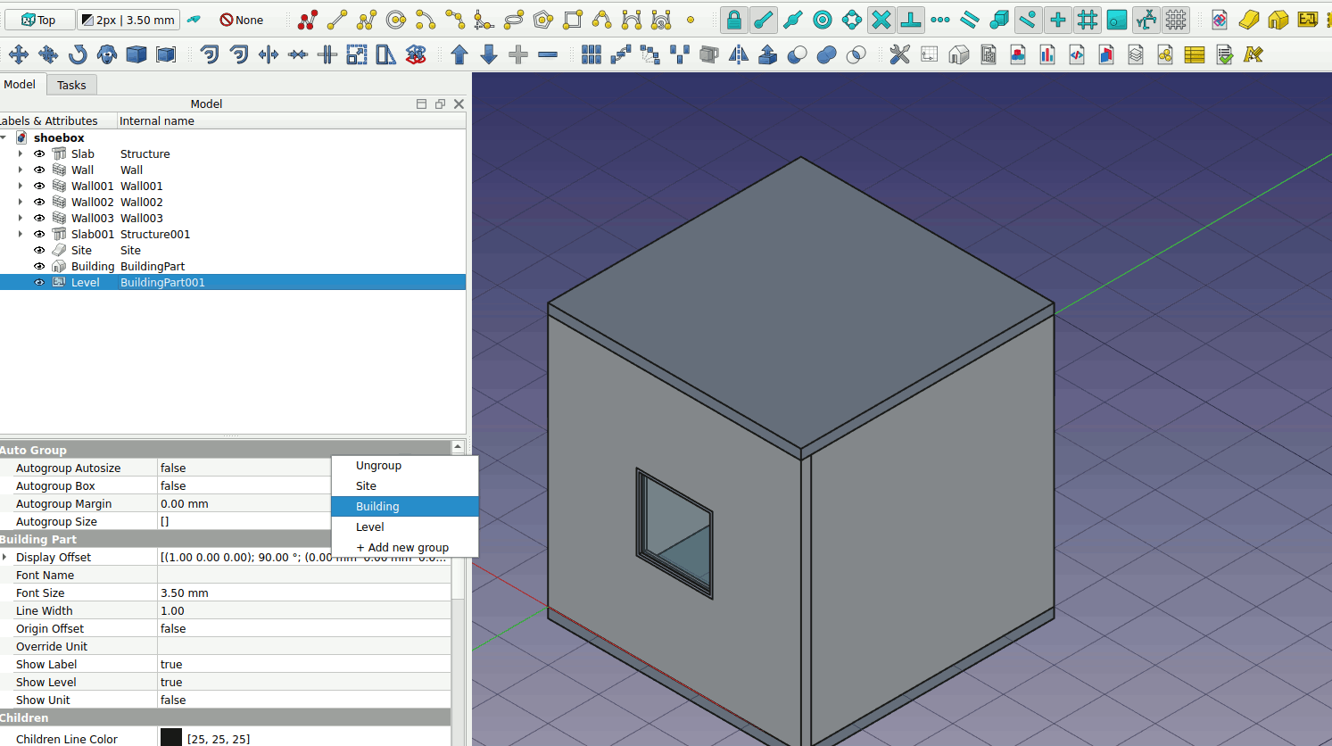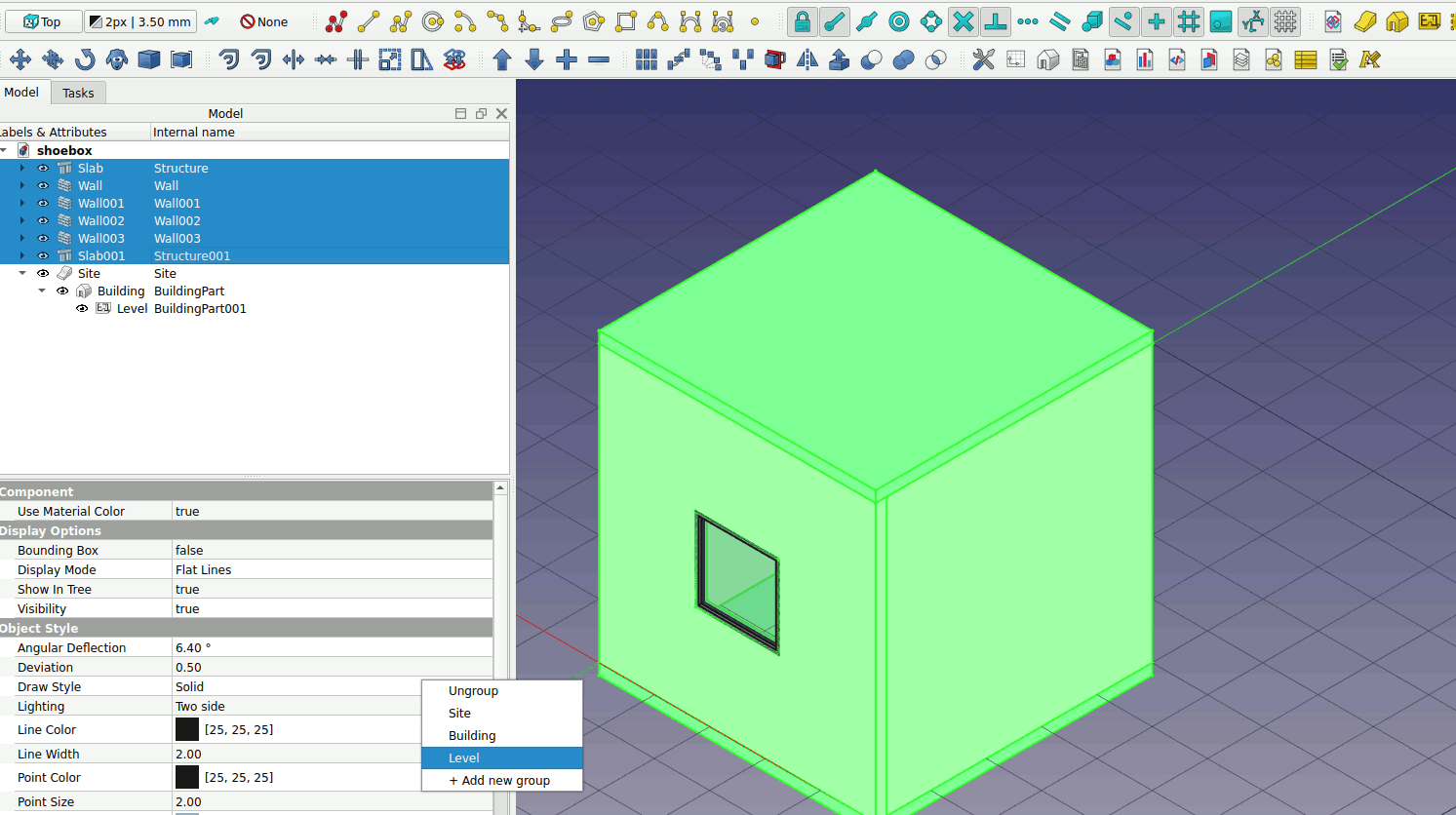 4. Select the slabs and walls by Shift + Left Click. Right click -> Move to group ... Repeat the same procedure for moving the all the selected object into the Level object.