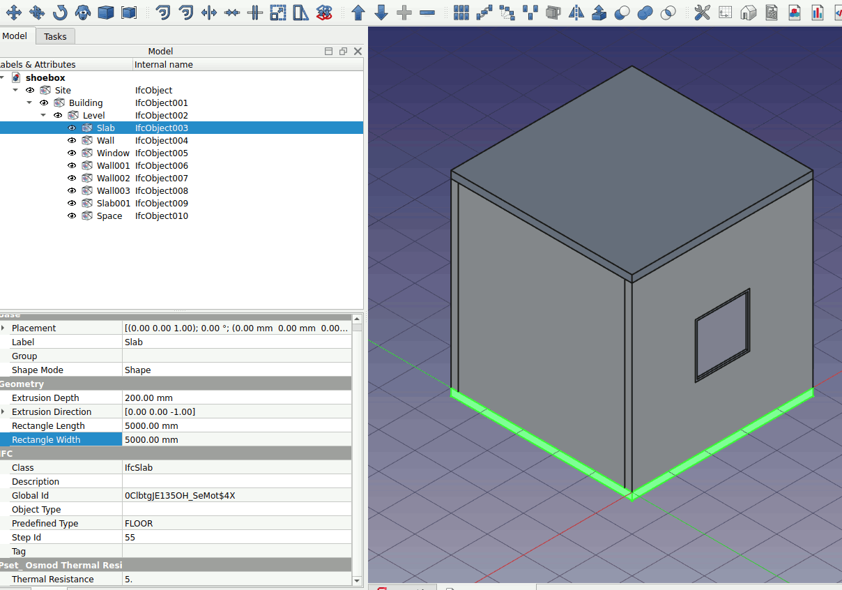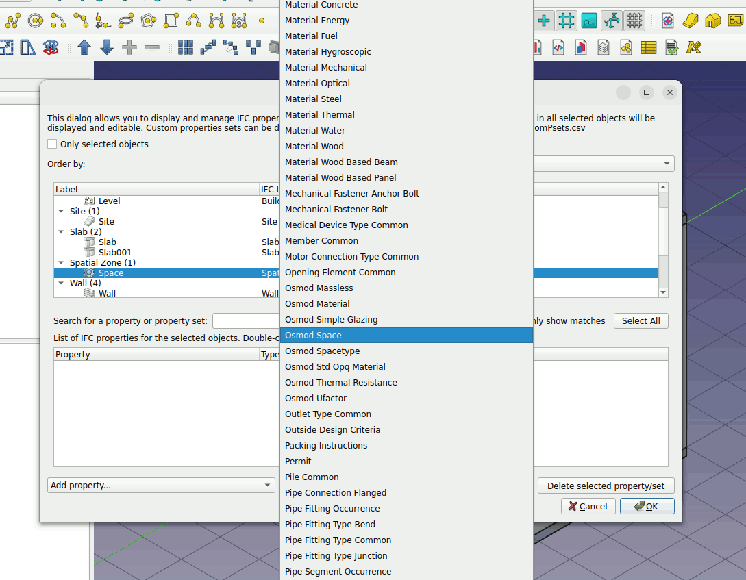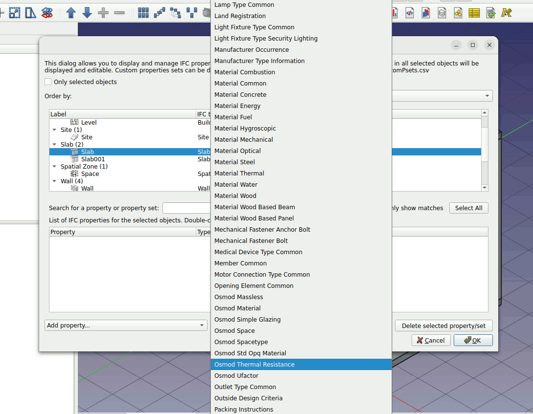 3. Select the slab object. Left click on the Add property set... parameter. Press O on the keyboard and choose ‘Osmod Thermal Resistance’. Do this for the roof, floor and walls.