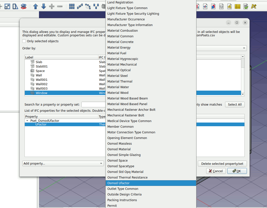 Select the window object. Left click on the Add property set... parameter. Press O on the keyboard and choose ‘Osmod Ufactor’.