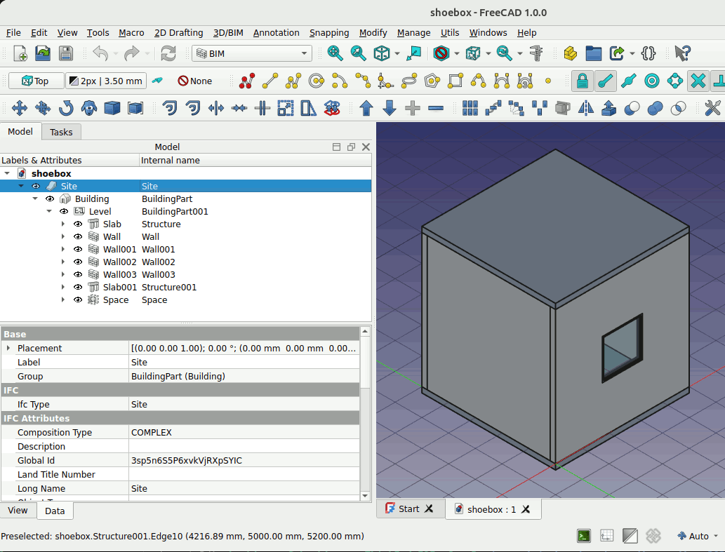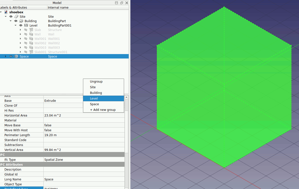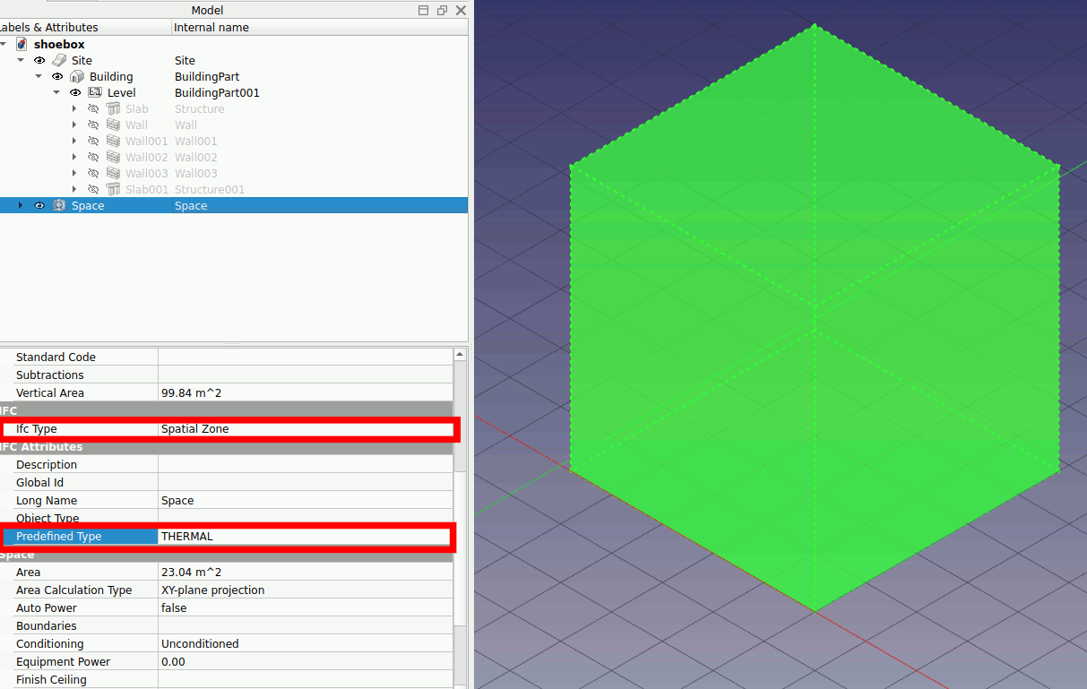 6. Select the Space. In the data view, change the Ifc Type to ‘Spatial Zone’ and the Predefined Type to ‘THERMAL’