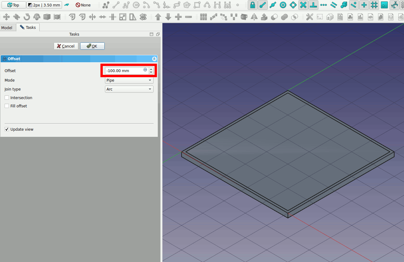 3. Select the floor slab and toggle visibility (press space to toggle visibility). Click on the arrow on the offset2d and also toggle visibility of Rectangle002. Select Offset2d and adjust the z position to -100mm. The floor slab like the wall slab is also 200mm thick. For the zone to be in the centerline you need the z-position to be -100mm.