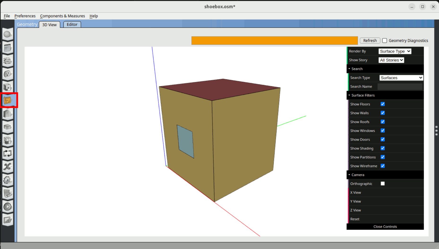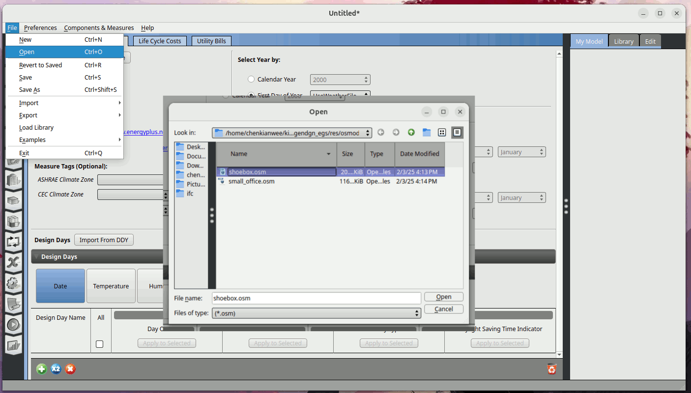 Open the shoebox.osm file with openstudio. Go to File -> Open and choose shoebox.osm.