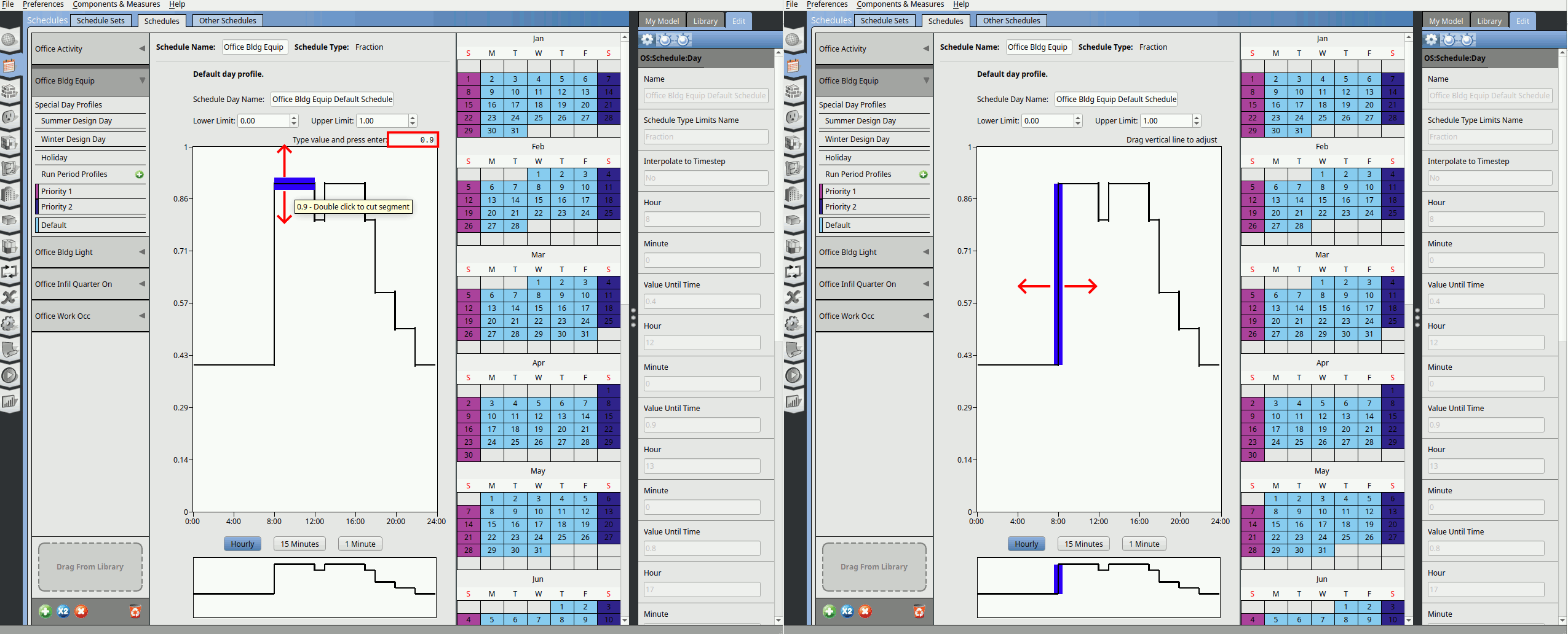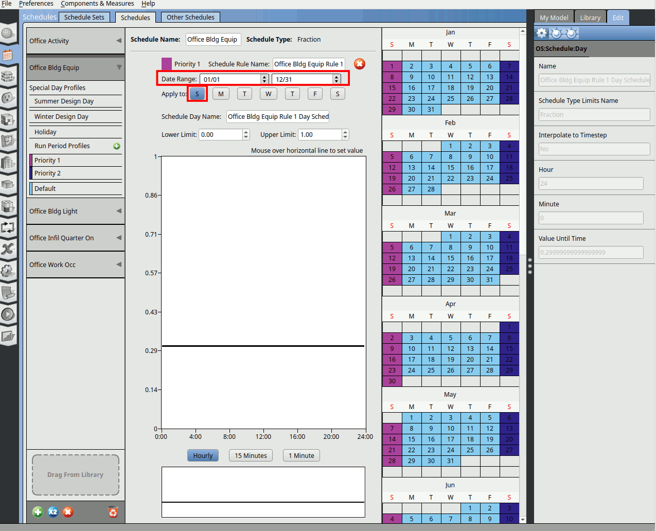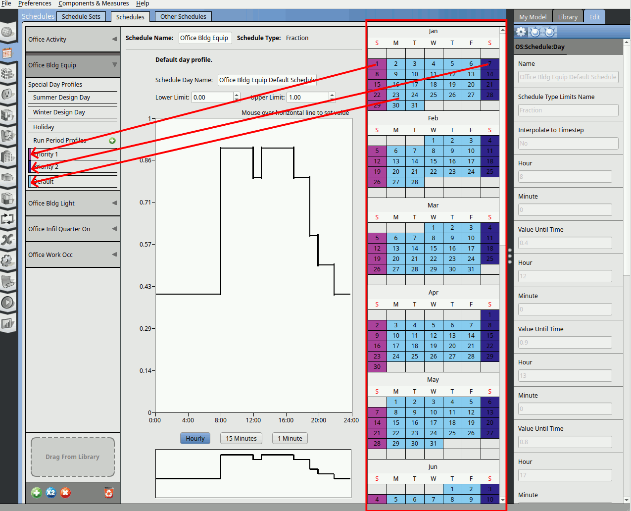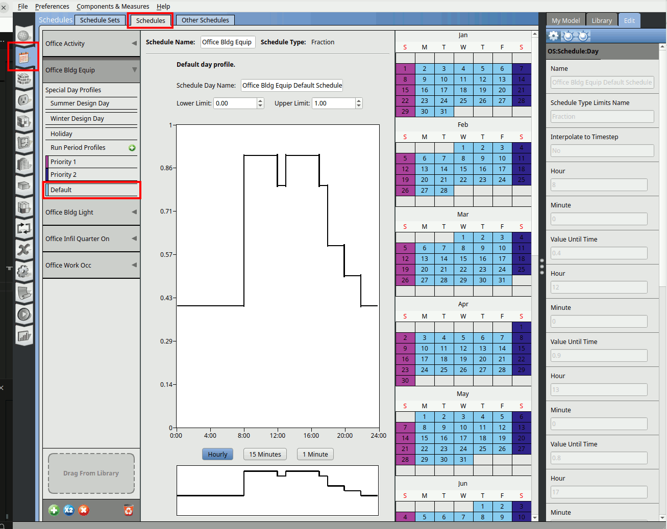 Go to the Schedules tab. In the schedules window click on the Schedules tab. Click on the Office Bldg Equip schedule and click on the Default.