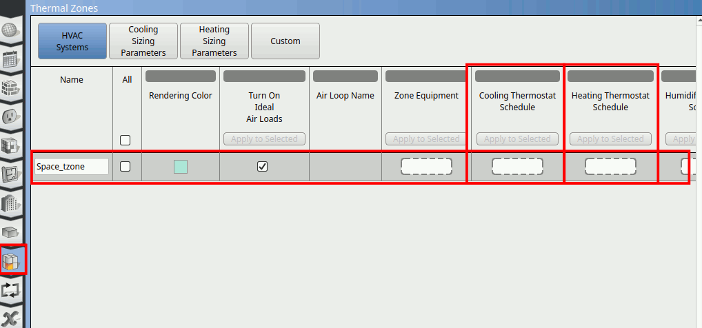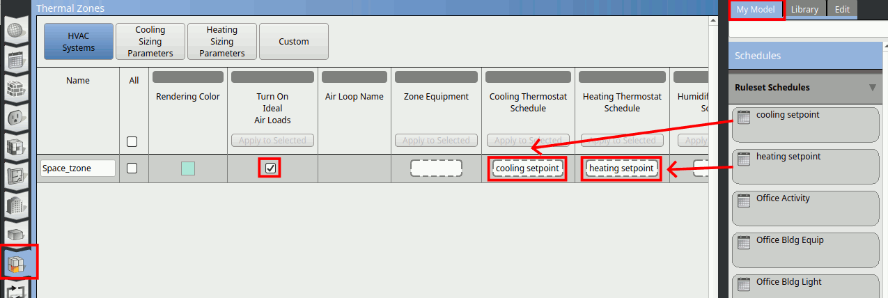 Go to Thermal Zones tab. Assign the cooling setpoint schedule to the Cooling Thermostat Schedule and heating setpoint schedule to Heating Thermostat Schedule. Tick the Turn On Ideal Air Loads.