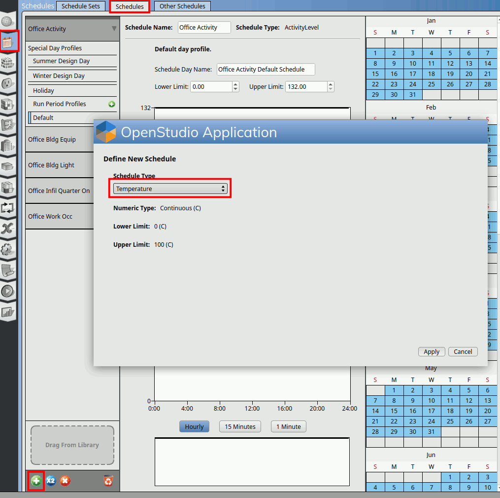 Go to the ‘Schedules’ tab. Click on ‘Schedules’ in the window. Click on the ‘+’ button at the bottom. A window will pop up. At the ‘Schedule Type’ parameter choose ‘Temperature’. There are many temperature schedule, choose the last one that has a lower limit of 0degC and upper limit of 100degC.