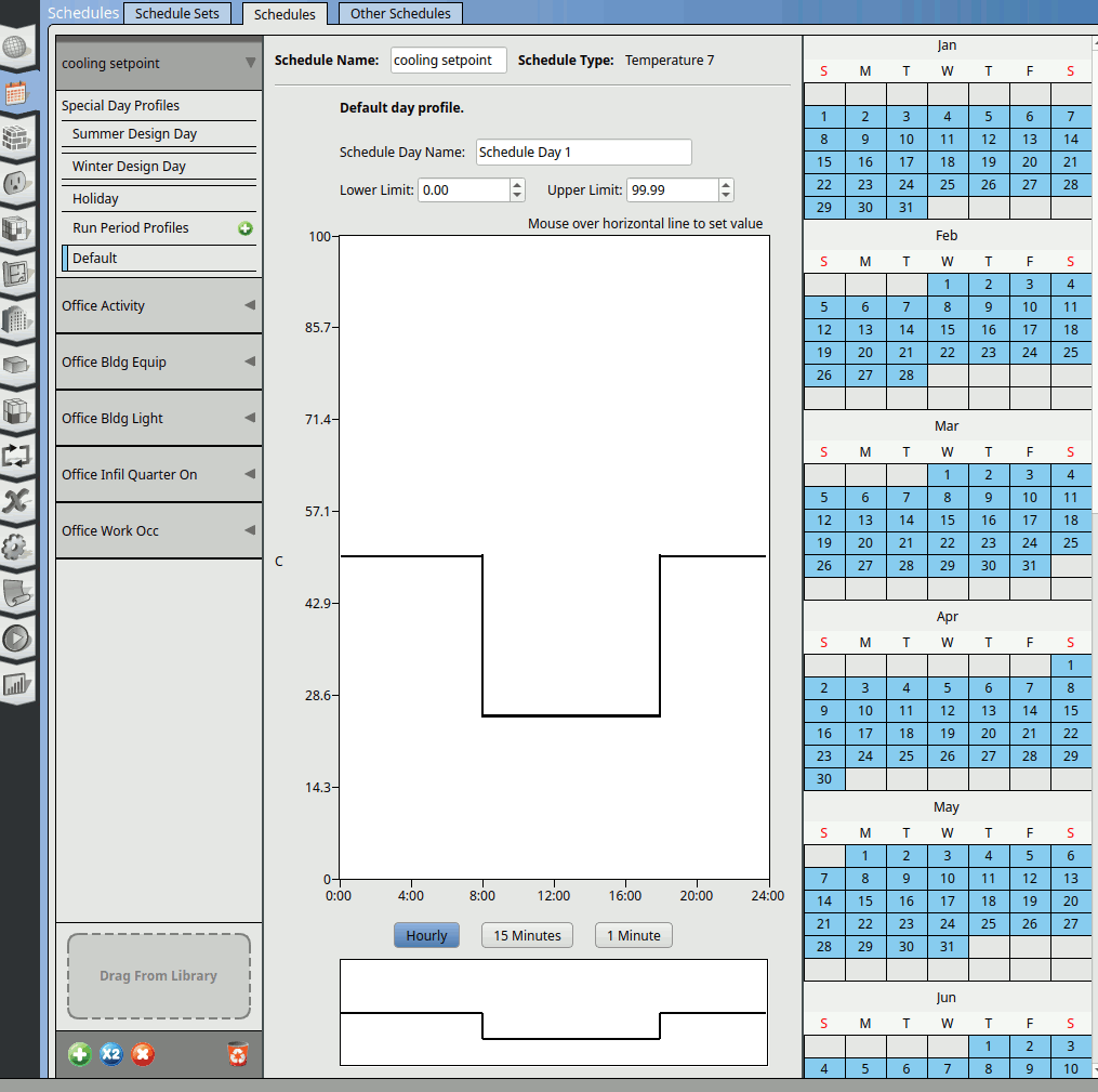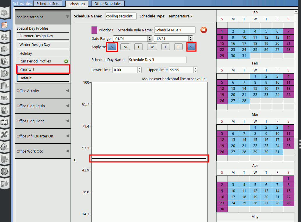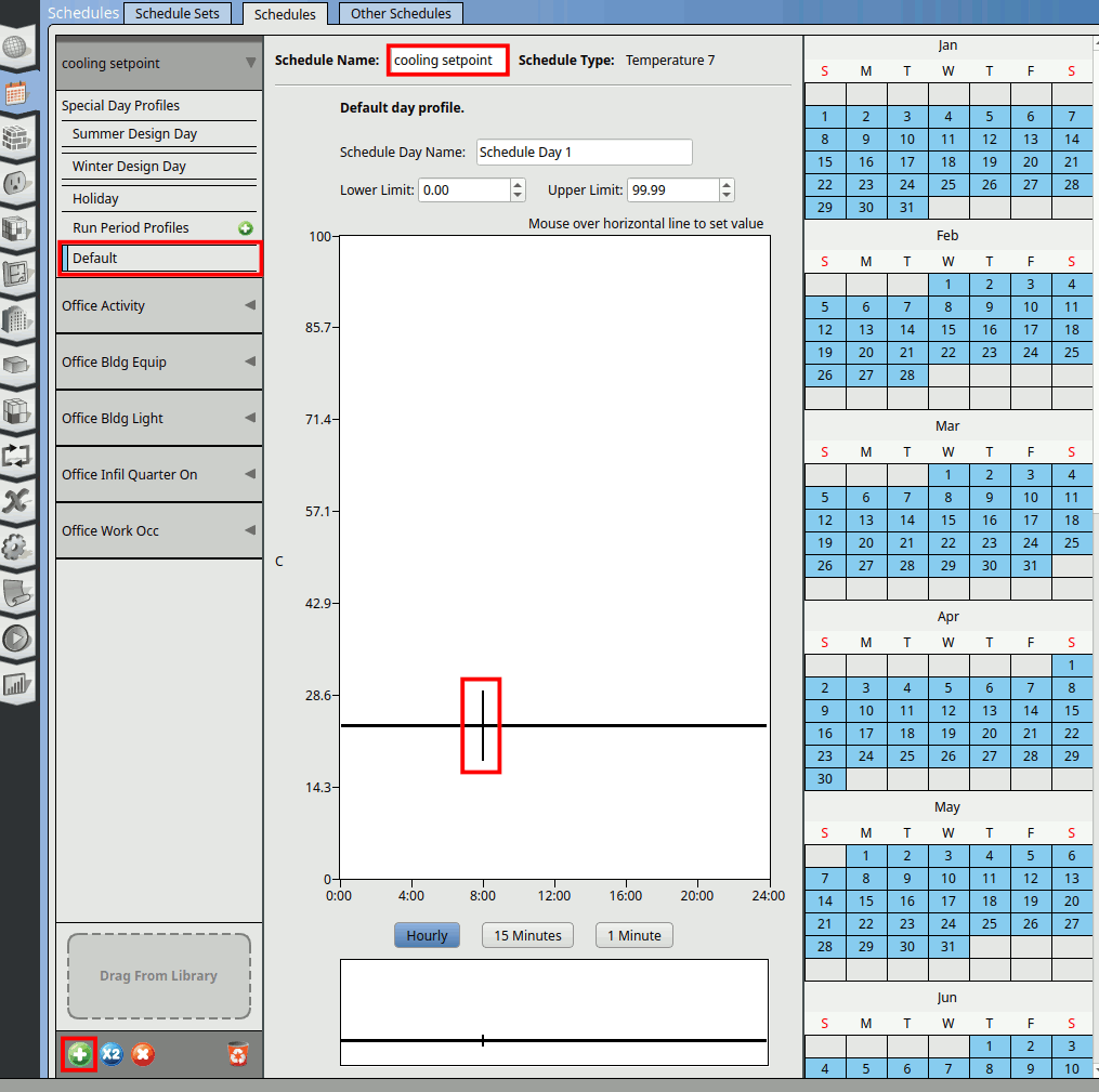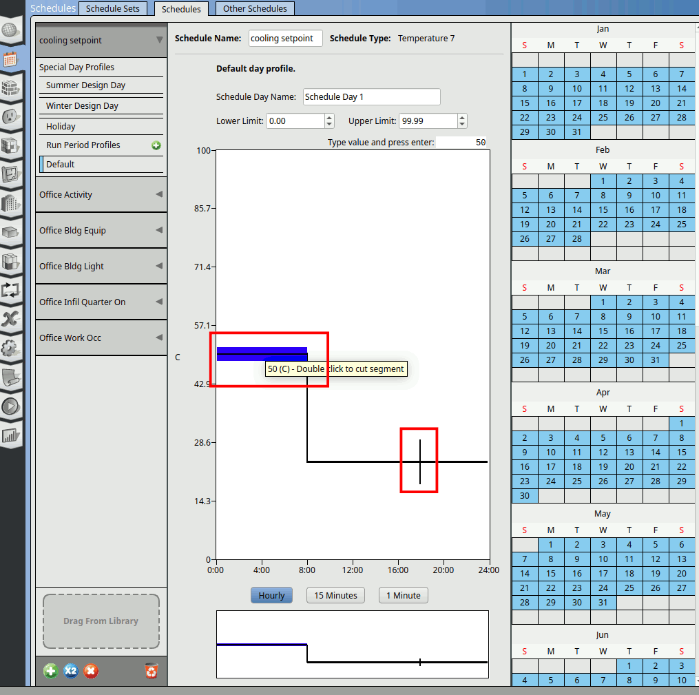 Change the name of the schedule to ‘cooling setpoint’. Click on the Default. Double click on the schedule line to create a cut as shown below. Pull it and place it at 8am.