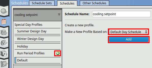Click on the ‘Run Period Profiles +’. Make a New Profile Based on: ‘Default Day Schedule’ and click Add. A ‘Priority 1’ schedule tab will appear.