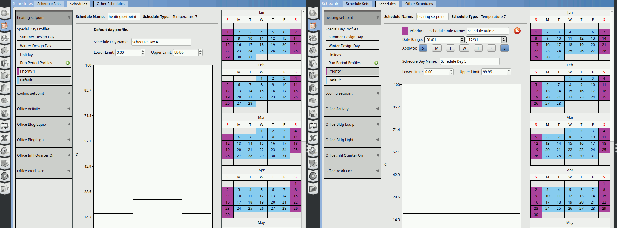 On the right calendar window. We can see that the days colored in light blue are assigned the Default schedule. The purple colored days are assigned Priority 1 and dark blue are assigned Priority 2.