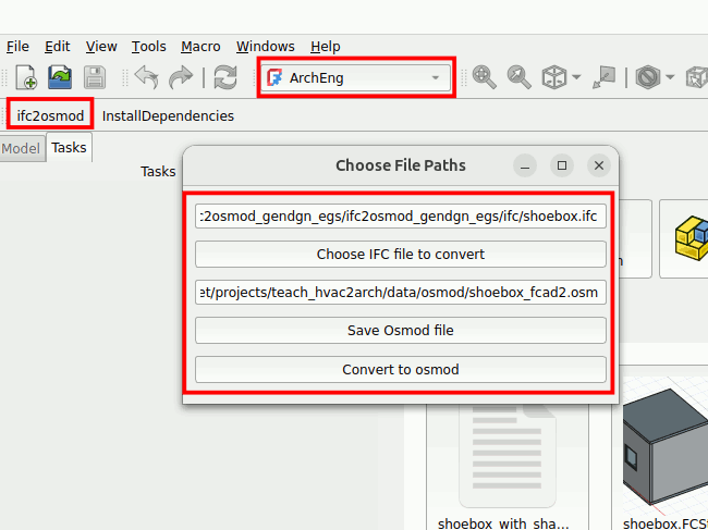 Click on the ifc2osmod button. Specify your ifc file and where you want to store your osmod file. Then click on ‘Convert to osmod’.