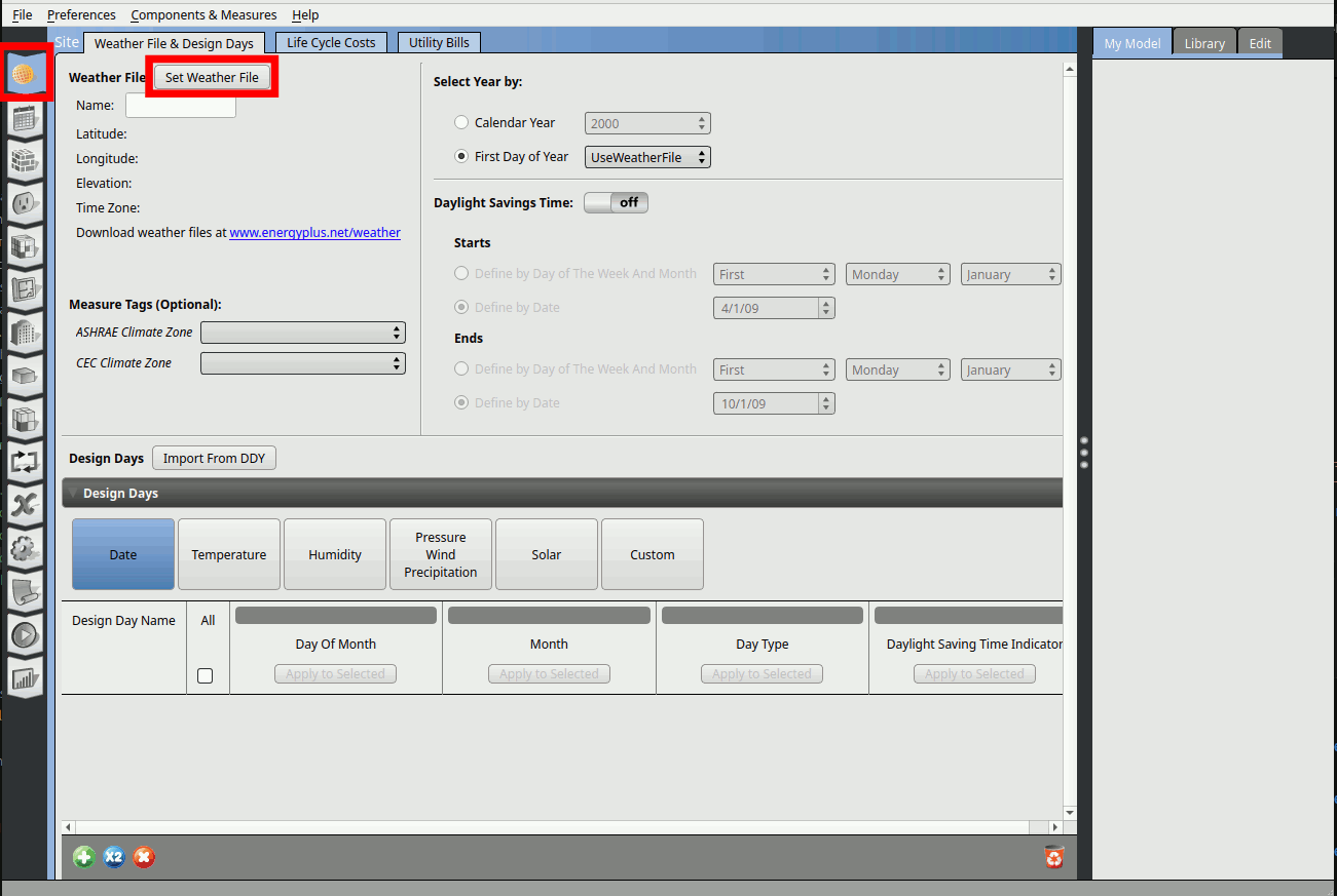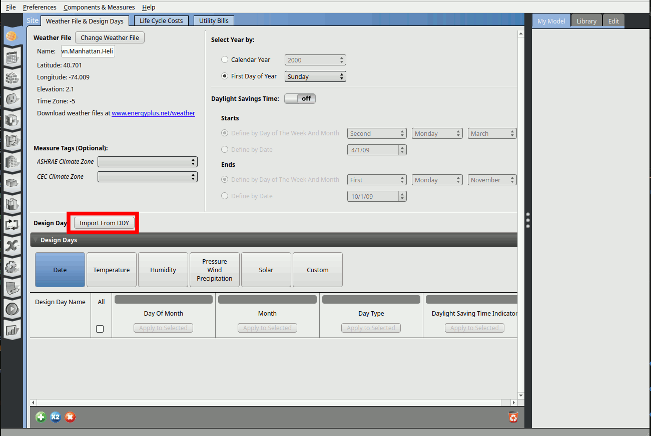 5. Set the design day information by clicking on Import From DDY.