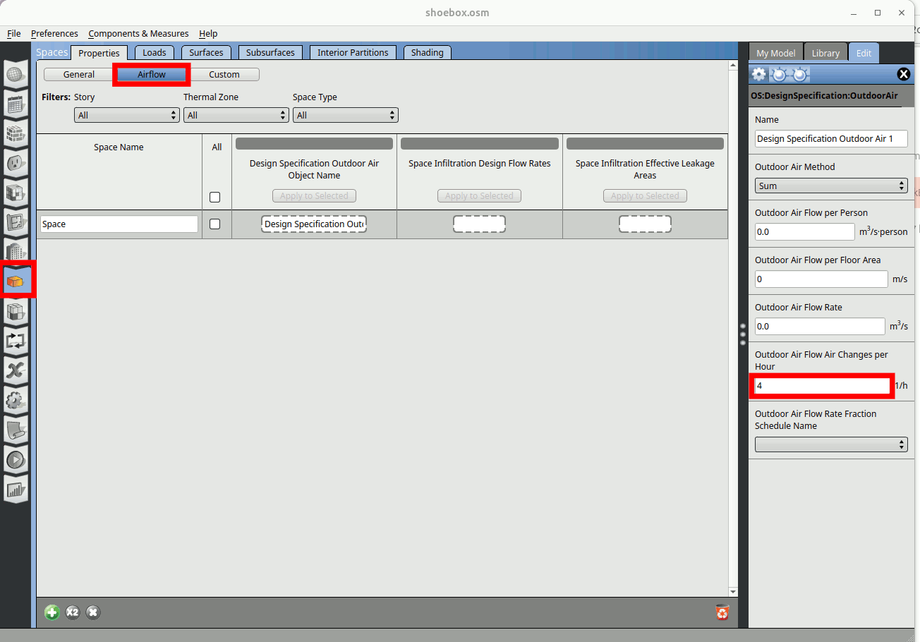 Go to the Spaces tab and click on the Airflow. Under the Design Specification Outdoor Air enter 4 Outdoor Air Flow Air Changes per Hour
