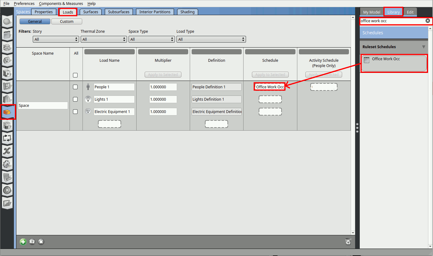 Go to the Loads tab. On the right window click on the Library tab, in the search bar type in ‘Office Work Occ’. Drag and drop the Office Work Occ schedule onto the People Definition 1 schedule parameter as shown below. Make sure the mouse shows a ‘+’ sign before you release the drag.