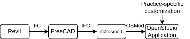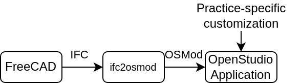 Then why not write an OSMod export for Speckle (speckle2osmod), so you can go from Revit → Speckle → OSMod. If I do this, I will need to maintain ifc2osmod and speckle2osmod for my workflow to remain open for Revit and FreeCAD, which will have overlapping functions with both libraries exporting to OSMod. If I do speckle2ifc and ifc2osmod, I do not repeat myself within the two libraries and each library serves a well-defined task. The latter case is conceptually clearer which makes it easier for maintenance.