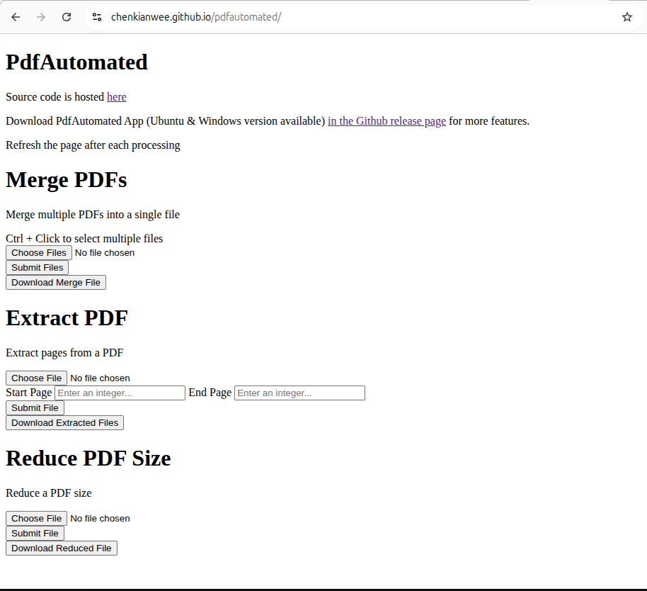 I wrote a PDF tool called PdfAutomated for myself. I want a tool that can merge and extract pages and reduce the size of PDFs as I always have to do this. I was using PDFSam to do the merging and extraction. Size compression is a paid feature and not available on the basic version. I used online tools to do the compression, which I am not fond of sending my PDF to servers of dubious free online tools that I found with a single search. I decided to build a tool to streamline my PDF-related works. As expected there is already a fairly matured Python library, pypdf, for reading and writing PDFs. I spend a weekend learning Beeware, wrote the codes and packaged it for Ubuntu and Windows (I do not have access to a MacOS machine). You can download the binaries here. The three images below shows the GUI.