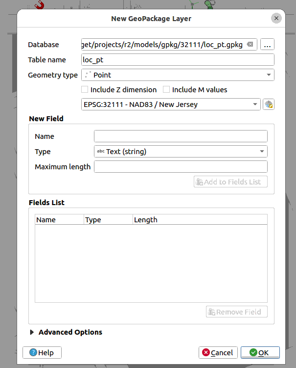 Draw a location point on the garage footprint as the reference point for our future operation. Go to Layer -> Create Layer -> New GeoPackage Layer. In the window fill in the parameters as shown below.