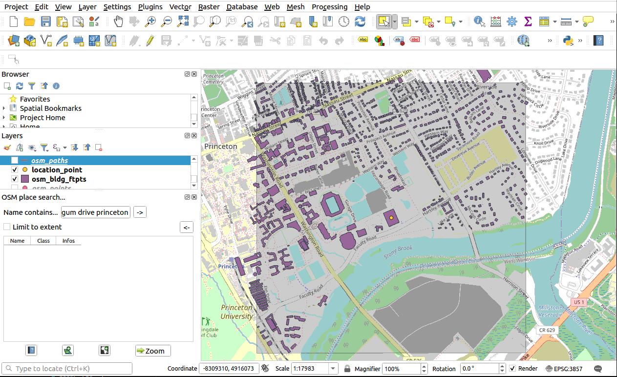 Also get the building footprint from the Microsoft Building Footprint Project. Follow the instructions here to get building footprint of your interest. Use the following parameters to extract buildings for Princeton. Then add the geojson into the canvas. Save the layer as geopackage as geojson has slow performance. The building footprint dataset from Microsoft includes building height, which makes building a 3d massing model of the site very handy.