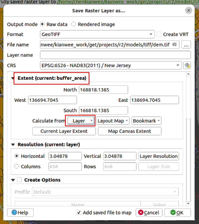 Once imported into QGIS, clip it with the buffer area. You can do this by right clicking on the layer -> export -> Save As ... In the dialog box clip the area with the “buffer_area” layer.