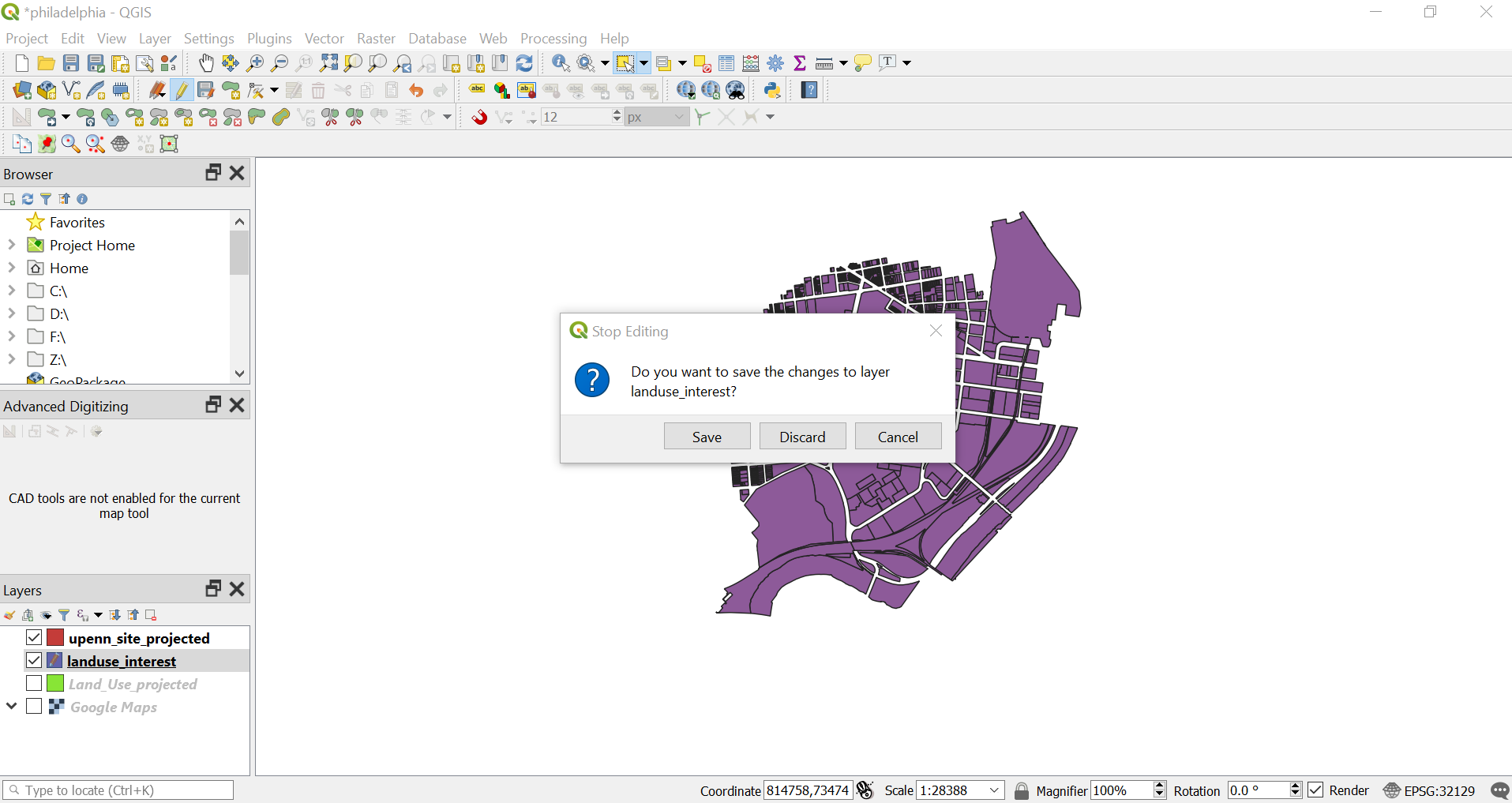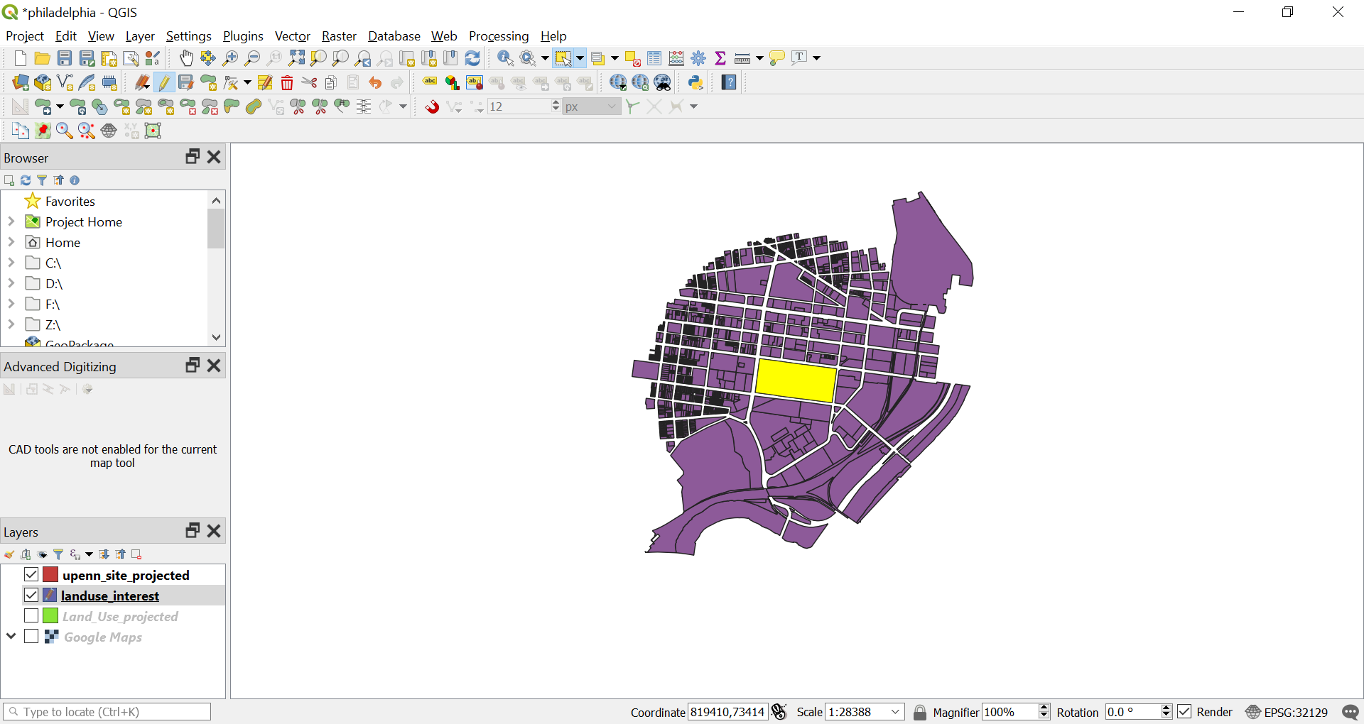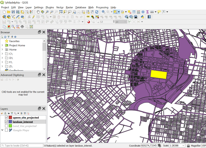 Choose the roads on the view screen. We can see that the whole road network of Philly is drawn as a single shape. It is very big and we do not need the road network for the Land Use map. Let’s delete the road network from the layer.
