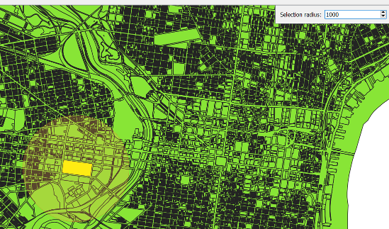 Click on the centre of our plot and enter 1000m radius. Press enter and the features will be selected.