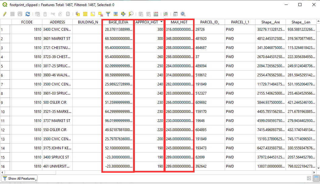 If we open the attribute table, we can see that we have the “BASE_ELEVA”, “APPROX_HGT” AND “MAX HGT”. With this three attributes this is enought to extrude the building footprint and create a 3D model of the area. However, most of the time you will not get such good quality data.