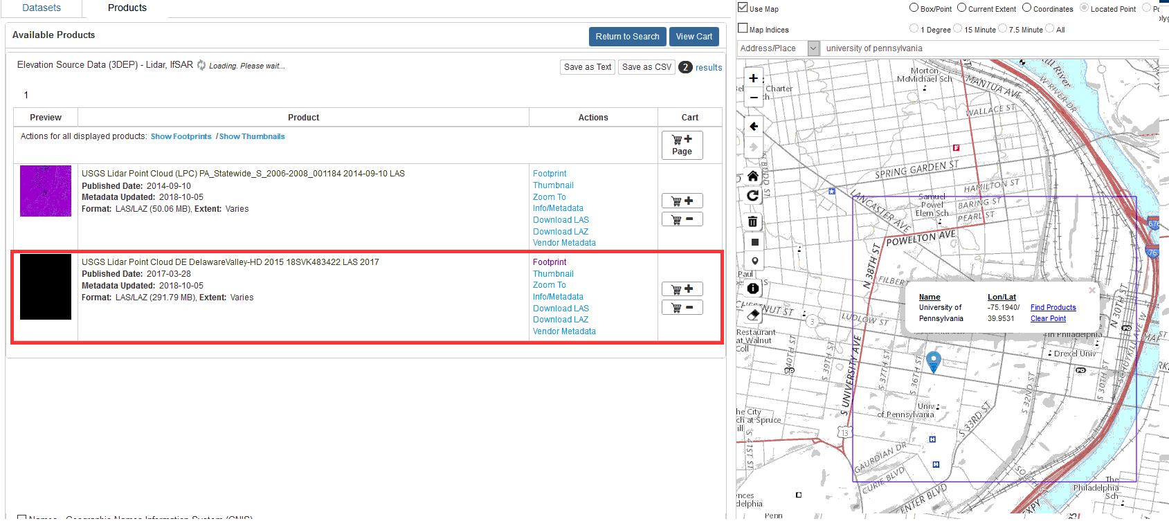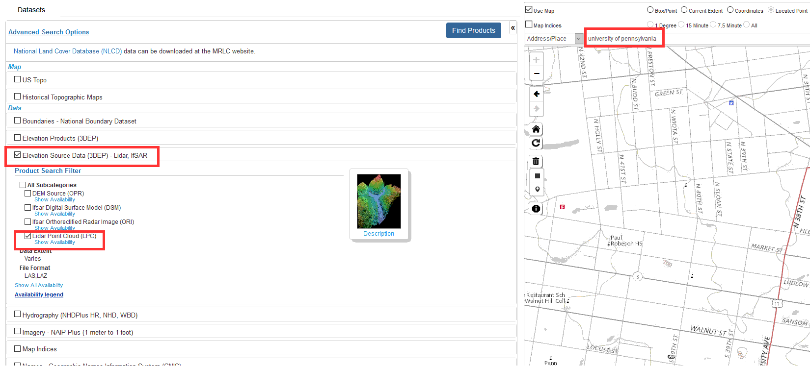 Go to nationalmap. Search for “university of pennsylvania” at the map window. Then at the dataset window click on Elevation Source Data (3DEP) - Lidar IfSAR -> Lidar Point Cloud (LPC). Click on “Find Products”.