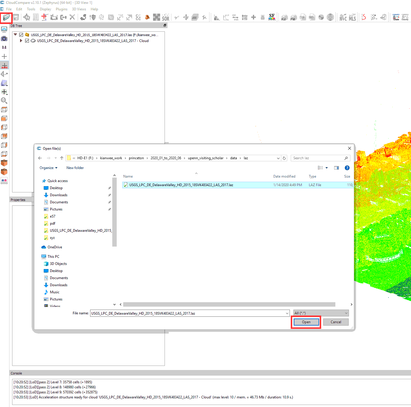 Download the file : USGS Lidar Point Cloud DE DelawareValley-HD 2015 18SVK483422 LAS 2017 Published Date: 2017-03-28. Click on “Download LAZ”.