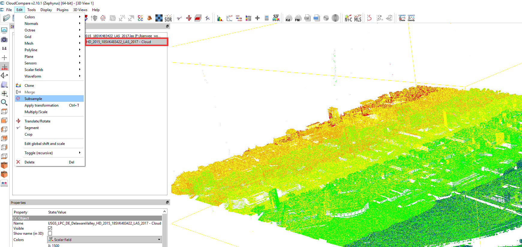 Click on the point cloud layer at the DB Tree Window to make it the active layer. Then go to Edit -> Subsample.