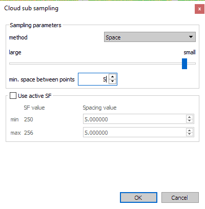 In the Cloud sub sampling window, choose the “Space” method. In the min. space between points to 5. This means that the density of the point clouds will be reduce to a 5m resolution. Click “OK”.