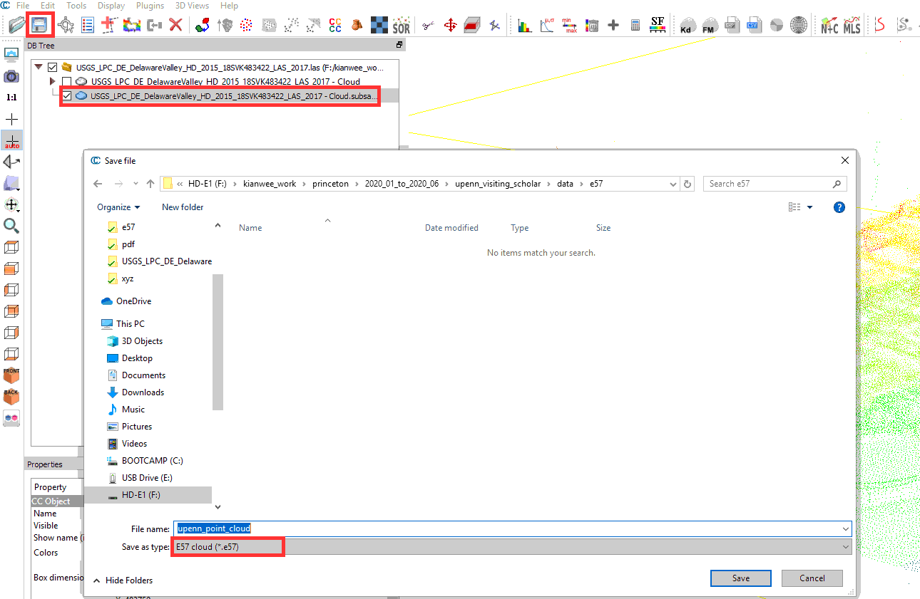 Click on the subsampled point cloud layer. Click on the Save icon. In the Save file window choose “E57 cloud (*.e57)” from the drop down list. e57 is a file format that can be imported into Rhino. Press “Save”.