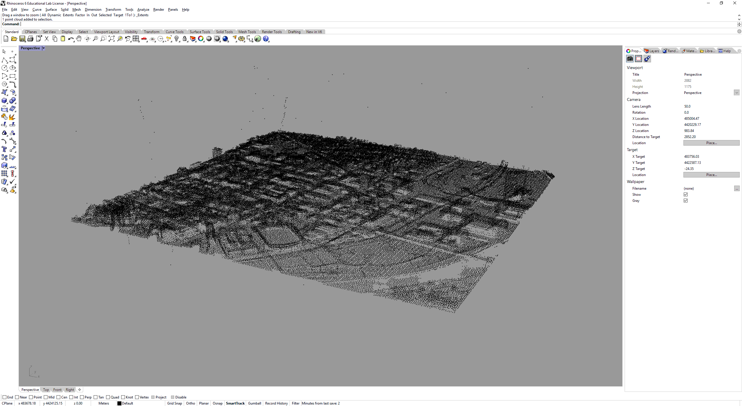 Open Rhino3D and import the file to check if the export is successful. As the point cloud is georeferenced, once its loaded, zoom extent to locate where is the point cloud.