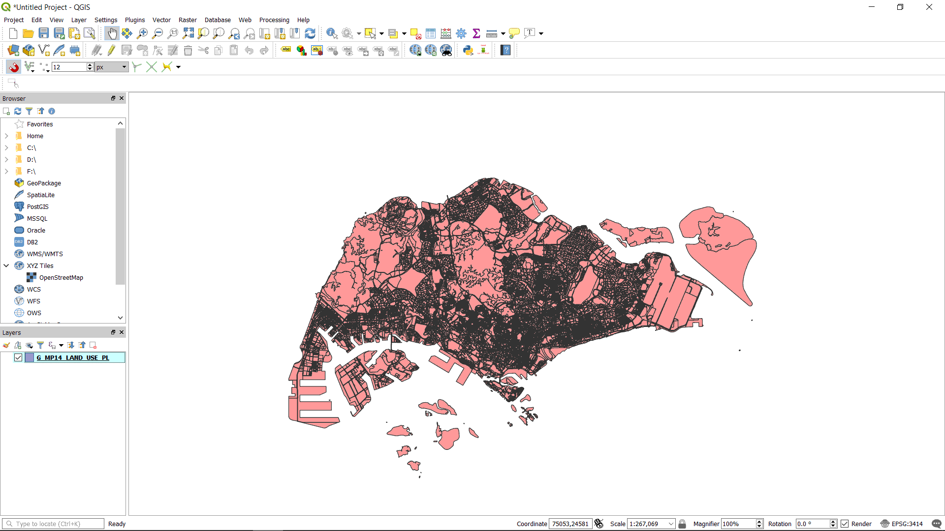 Search for open geospatial data of Singapore (Follow Singapore Master Plan). Then import the obtained shapefile into QGIS (Import Vector Layers into QGIS). Set it to the right Coordinate Reference System (CRS) (Setting CRS, GRS or PCS)