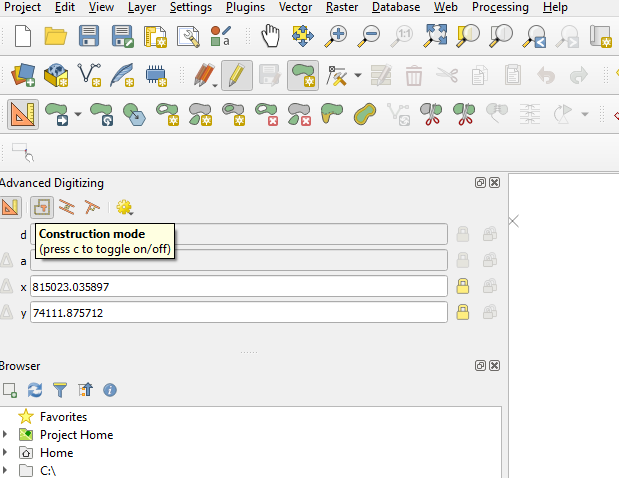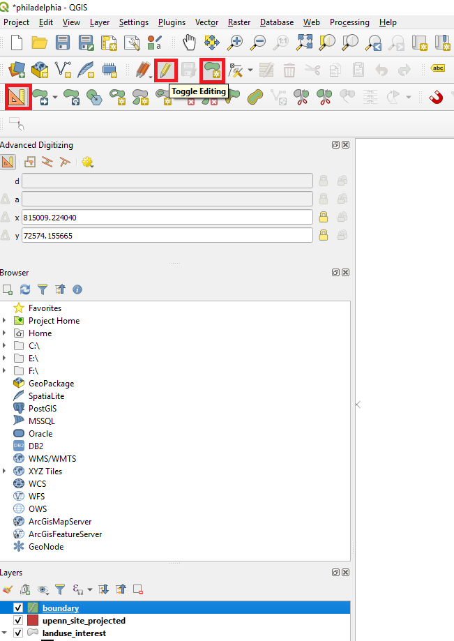 Once the layer is created, click on the layer so that it is the active layer. Then click on the " Toggle Editing" icon, follow by “Add Polygon Feature”.