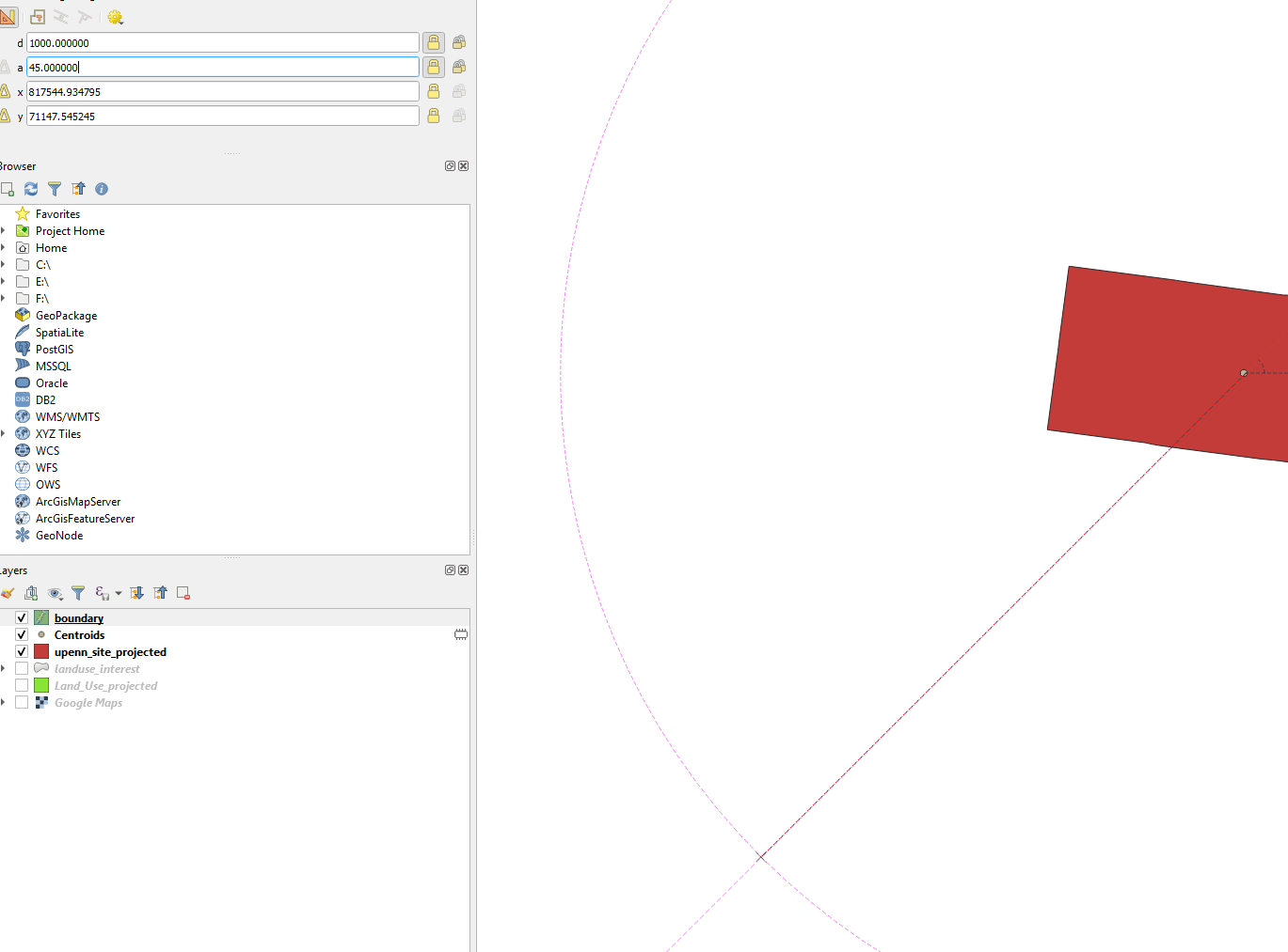 Start drawing, you can enter the distance of the line and the angle. Draw a line by entering the d (distance) and a (angle) of the line. The example shows a line of 1000m and at 45 degree.