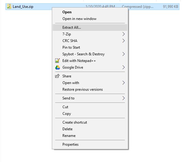 After unzipping. You will be able to see 5 files in the Land_Use folder. You must always keep these files together in a folder for the SHP file to work.