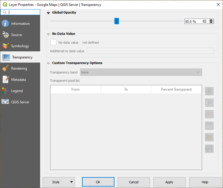 Go the Transparency tab and adjust the Global Opacity to the percentage value you want and click Apply.