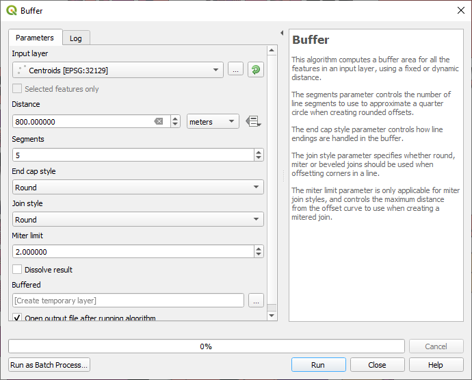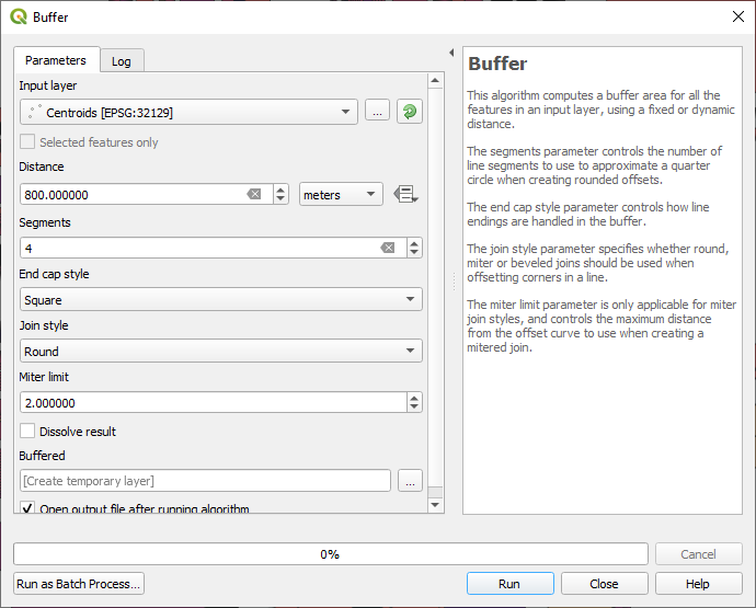 In the buffer window, choose the point layer for the buffering. The layer needs to be a point. Click on run.