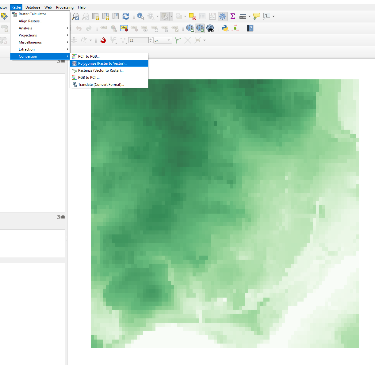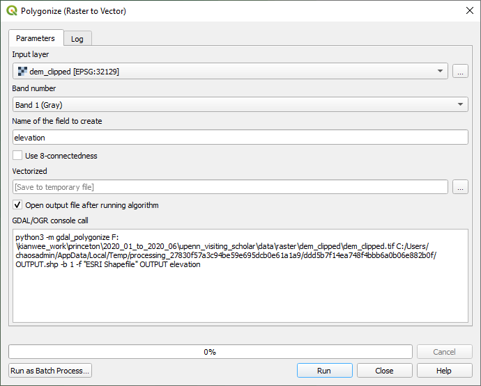 Choose the input layer that you want to polygonise. Choose which band to convert to an attribute in the polygon layer. Choose the name of the attribute. Click on Run.