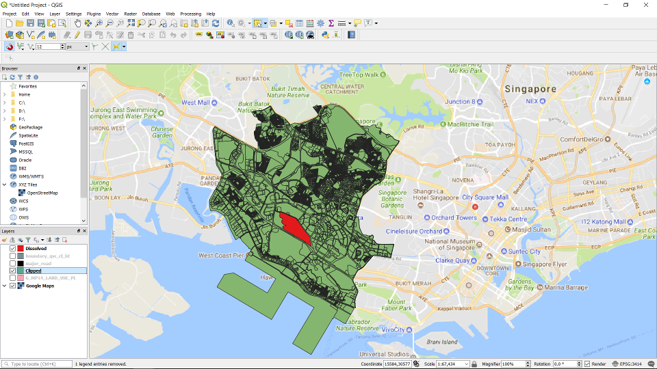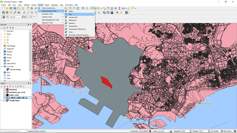 Specify the layer to be clipped in the “Input layer parameter”, and the clipping layer in the “Clip Layer” parameter. The two layers need to be using the same PCS (refer to task-4 to better understand GCS & PCS).